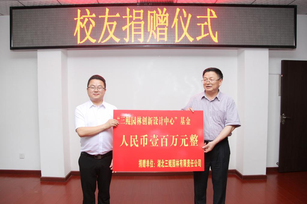 5月26日下午,我校校友、湖北三鲲园林有限责任公司董事长易承进先生向我们捐资100万元用于建设必威BETWAY官网“三鲲园林创新设计中心”仪式在校史馆举行。