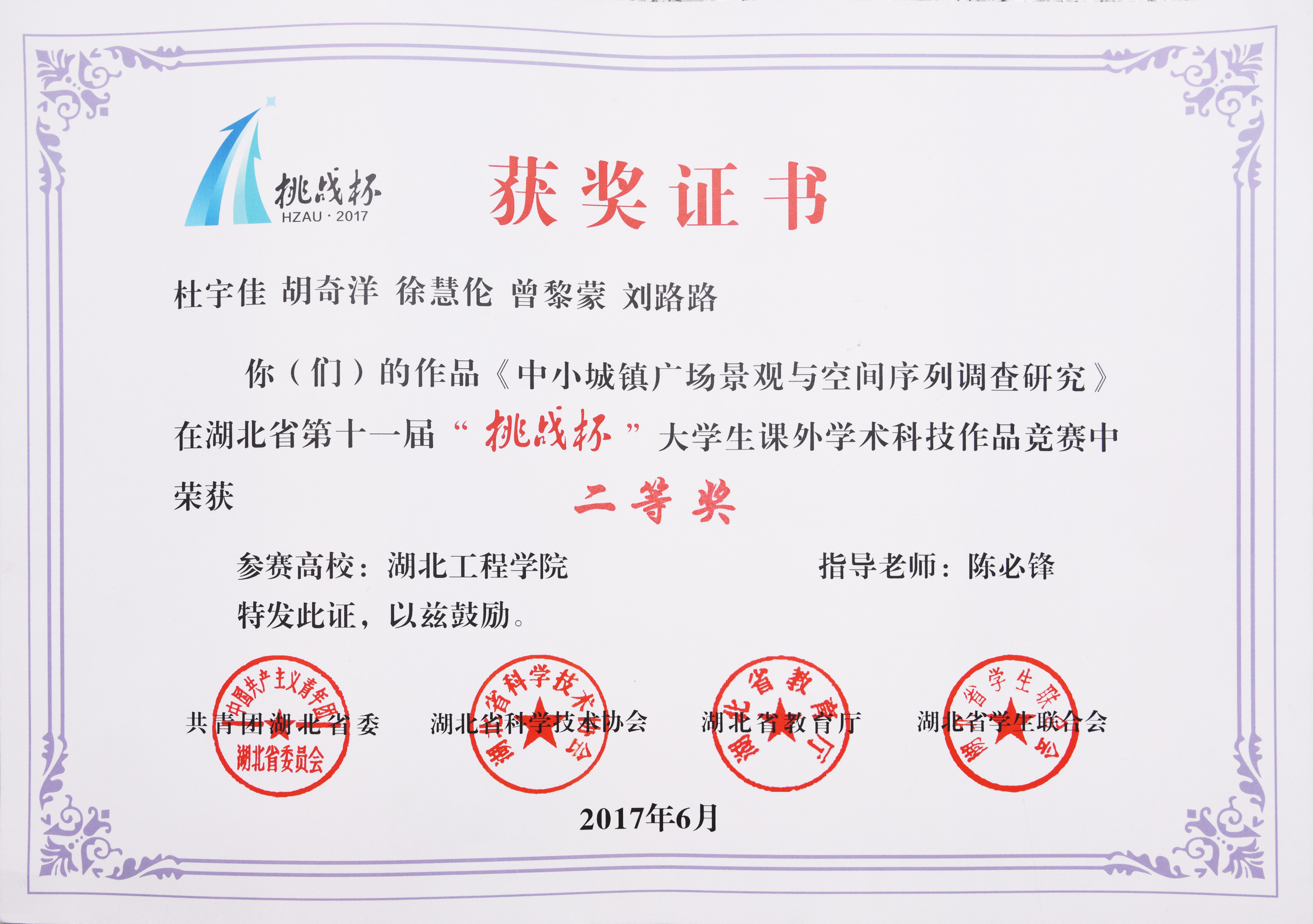 6月8日至9日,由共青团湖北省委、湖北省科学技术协会、湖北省教育厅、湖北省学生联合会共同主办的湖北省第十一届“挑战杯”大学生课外学术科技作品竞赛终审决赛暨闭幕式在华中农业大学举行。我们由陈必锋老师指导,杜宇佳等同学作品《中小城镇广场景观与空间序列调查研究》荣获二等奖。