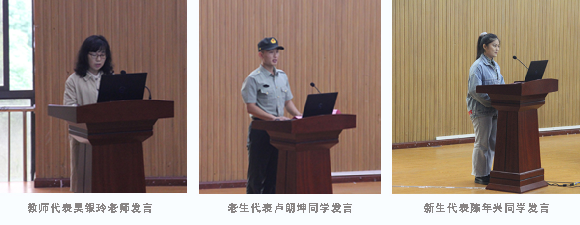 第一阶段在雄壮的国歌声中开学典礼拉开了帷幕,学校第三届“师德标兵”吴银玲同志作为教师代表发言,她从学会感恩、学会生活、学会选择诠释了十余年来的所得所获所感,同时向新同学提出多去图书馆浸泡、多去运动场打卡、积极参加社团和社会实践活动、计划每个月都好好读一本书等四点建议。退役军人学生会主席卢朗坤同学作为老生代表发言,他以自己的亲身经历,分享了加强品德修养、加强自我管理、加强创新实践等三点体会。新生代表0203019251班陈年兴同学提出适应新生活,树立新目标;严于律己,宽以待人;学会学习,端正三观;尊师重道,感恩同行等四点建议与全体新生共勉。