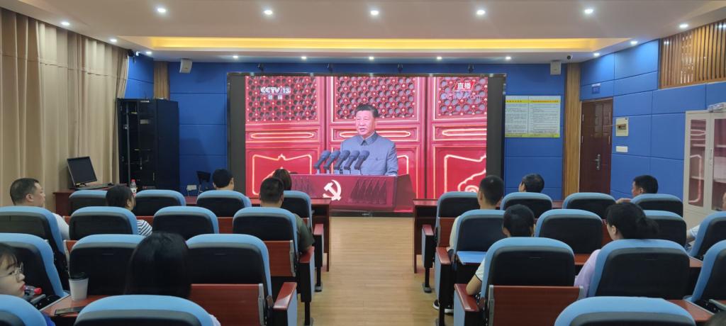 庆祝中国共产党成立100周年大会7月1日上午8时在北京天安门广场隆重举行。中共中央总书记、国家主席、中央军委主席习近平发表重要讲话。我们全体在校班子成员及师生党员在天成楼306通过网络观看直播,认真聆听总书记重要讲话,共庆建党一百周年。大家看盛会、听报告、会后大家纷纷表示此次大会令人倍感振奋、备受鼓舞。