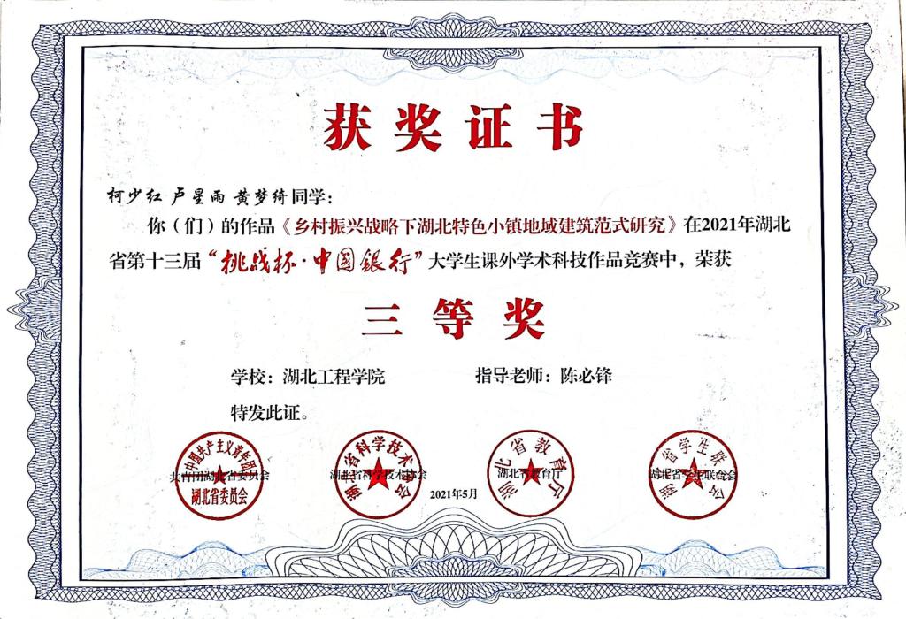 由共青团湖北省委员会、湖北省科学技术协会、湖北省教育厅、湖北省学生联合会共同主办的湖北省第十三届“挑战杯·中国银行”大学生课外学术科技作品竞赛中南民族大学落下帷幕,来自我们的参赛作品《乡村振兴战略下湖北特色小镇地域建筑范式研究》荣获三等奖。