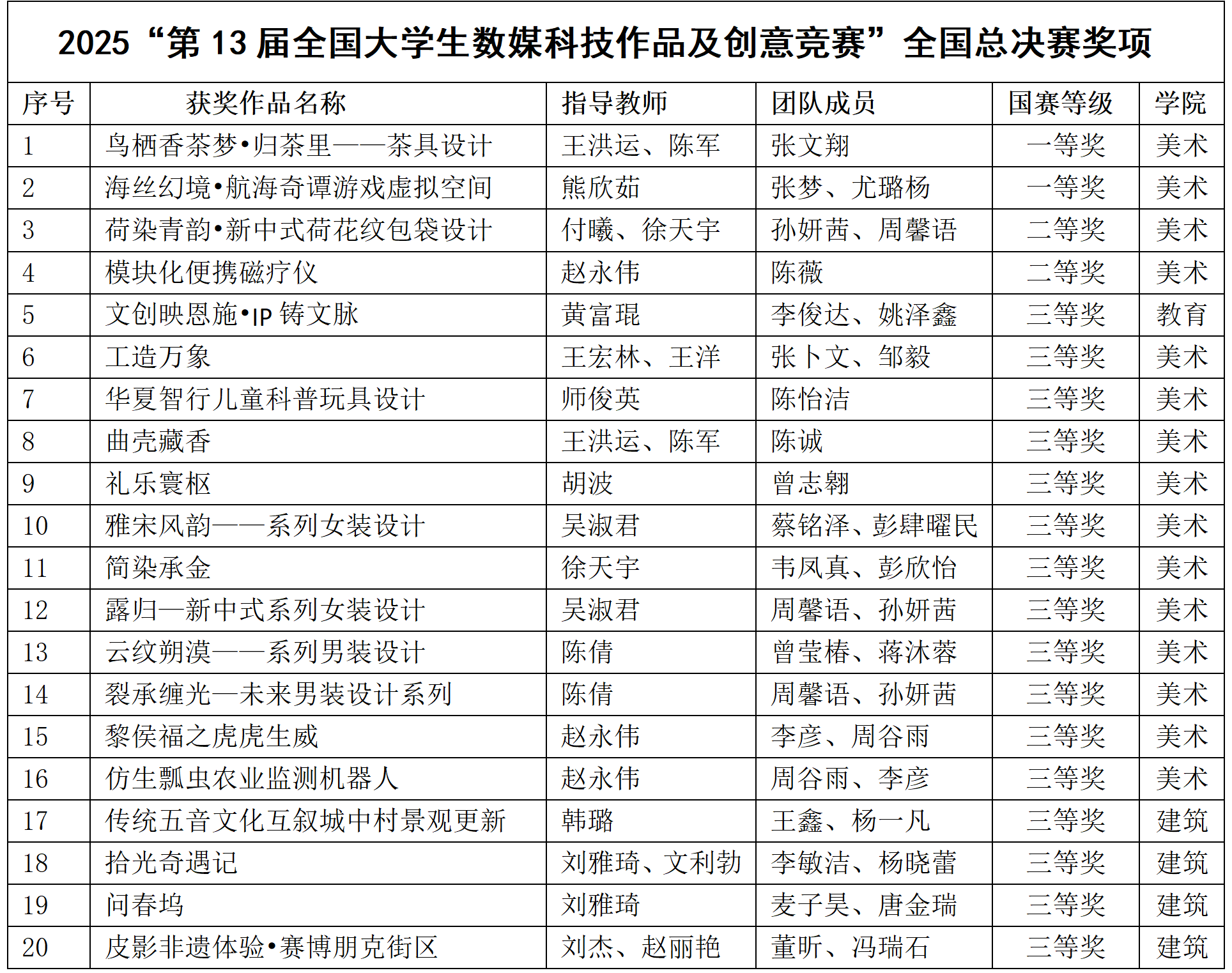 此前,在2025年第十三届“全国大学生数字媒体科技作品及创意竞赛”省赛评比上,我们学子获奖7项(其中,二等奖3项、三等奖4项)。此次的校赛遴选由学校教务处主办、美术与设计学院具体承办。从全校9个学院共500余件作品中进行评审淘汰,并按照“校赛——省赛——国赛”三级赛制逐级上推参赛。