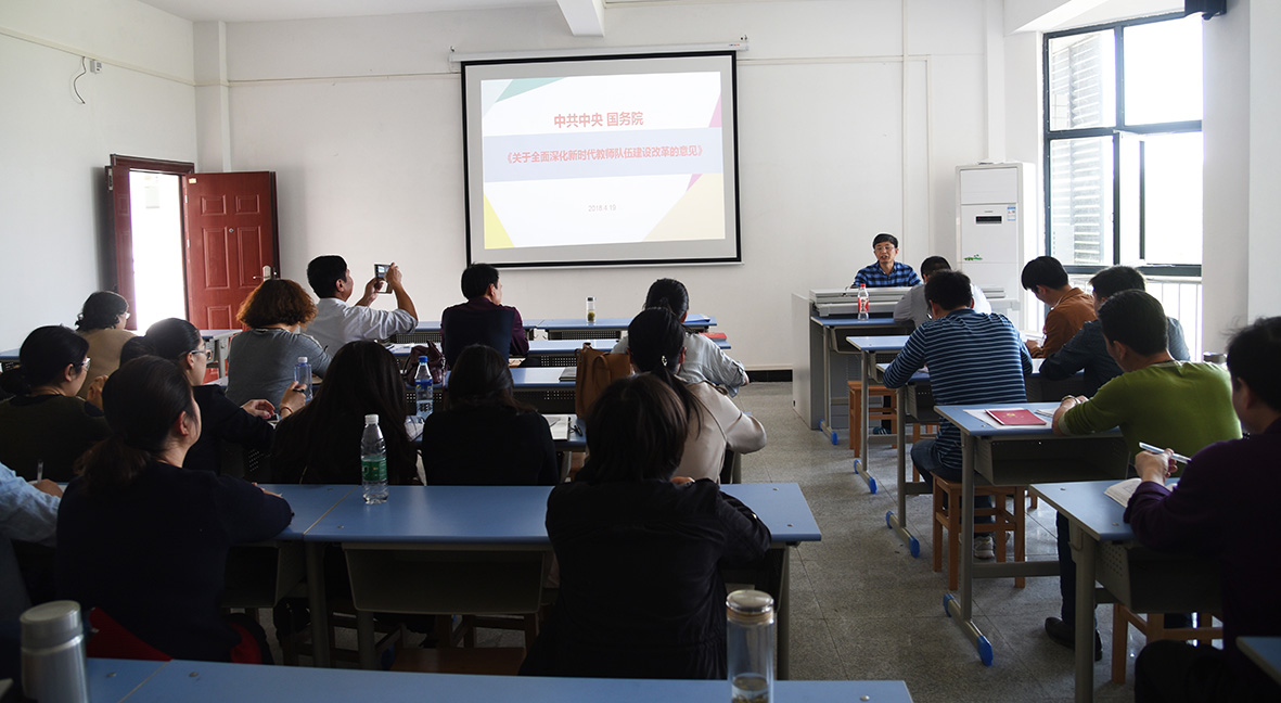 4月19日下午,我们全体教职工在天成楼414集中进行政治理论学习暨教工支部主题党日活动,本期的主题是学习《关于全面深化新时代教师队伍建设改革的意见》,活动由党总支书记、院长胡波同志主讲。胡波同志先解读了《batway必威官方网站2018年教职工政治理论学习安排意见》,随后从坚持兴国必先强师,深刻认识教师队伍建设的重要意义和改革措施两个方面进行了生动的讲解。同时领学了《省教育厅等五部门关于落实和扩大高校办学自主权深化高等教育领域简政放权放管结合优化服务改革的实施意见》二十条。通过本次学习使全体教职工理解新时代高校教师队伍建设重要意义和总体要求,增强责任意识和使命感,牢固树立自身创新发展的要以。